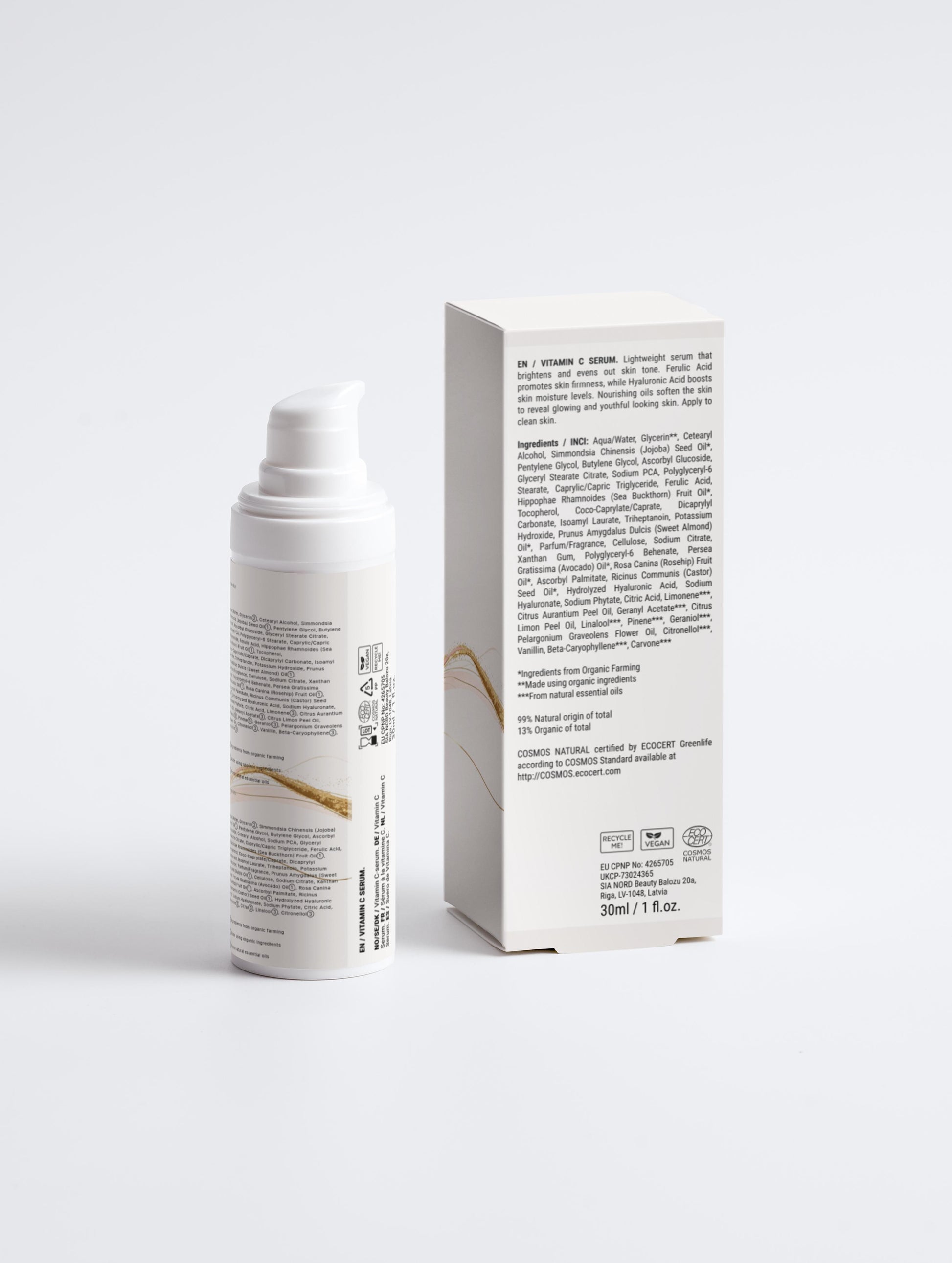 2% Natural Vitamin C (Ascorbyl Glucoside), 1% Ferulic Acid, 1% Ses-Buckthorn Oil, Vitamin E, Jojoba Seed Oil, Almond Oil, Avocado Oil, Rosehip Seed Oil, Sodium PCA, Hyaluronic Acid.